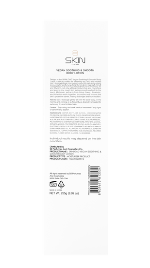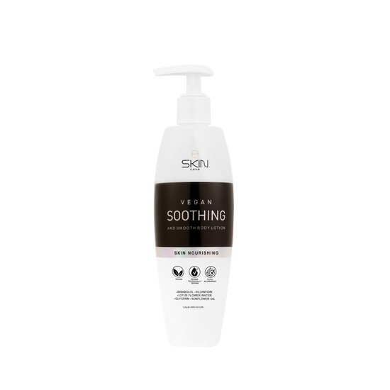 Experience the comfort of SKINLOAD Vegan Soothing & Smooth Body Lotion, a lightweight, non-greasy formula designed to deeply nourish, calm, and restore balance to dry, red, and irritated skin. Enriched with Sunflower Oil, Lotus Flower Extract, Bisabolol, Allantoin, and Glycerin, this lotion provides long-lasting hydration while reinforcing the skin’s natural barrier. It leaves your skin soft, smooth, and radiant, making it ideal for daily use on sensitive or stressed skin.